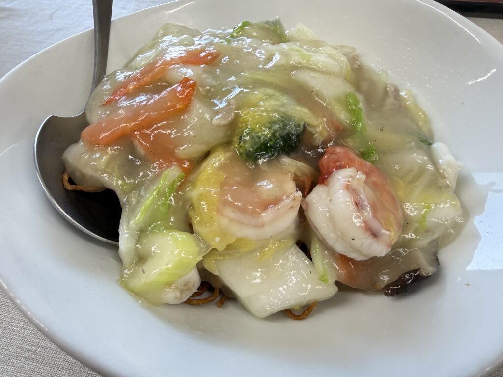 揚げ麺の食感と、海老と貝の旨味を感じられて、おいしいです。