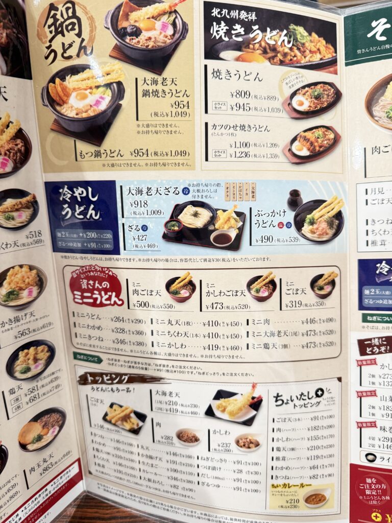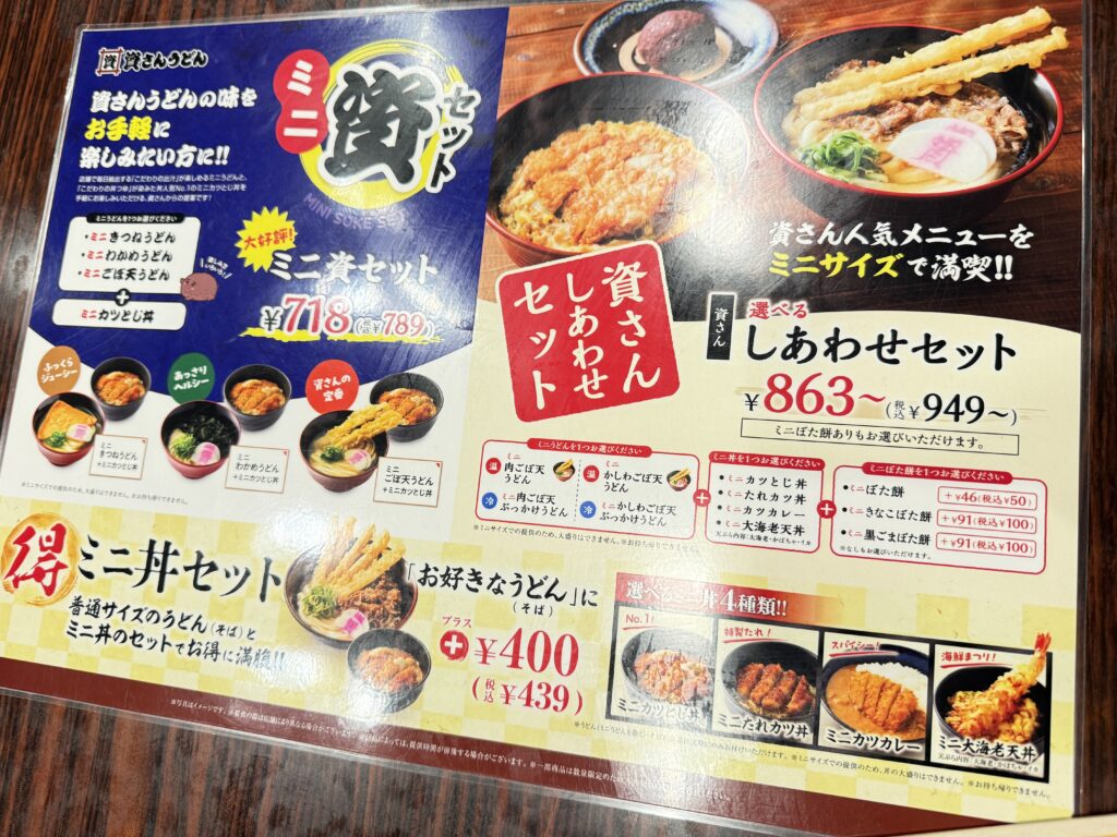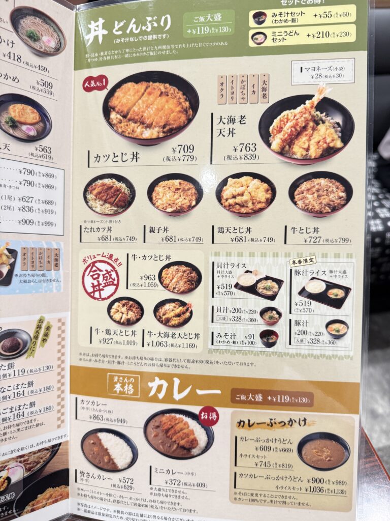 資さんうどんといえば、ごぼうの天ぷらの乗ったうどんのイメージですが、そばやどんぶりもあります。