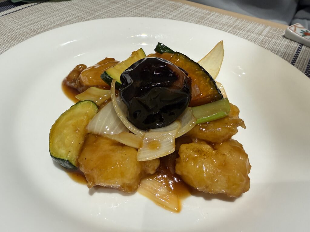 海老とズッキーニなどの野菜に 優しい甘酢がよくからんでいます。