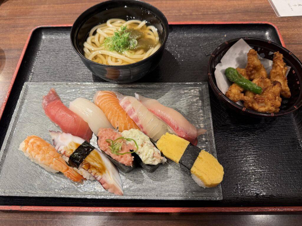 お寿司10貫、とり天、昆布うどん(または赤だし)です。