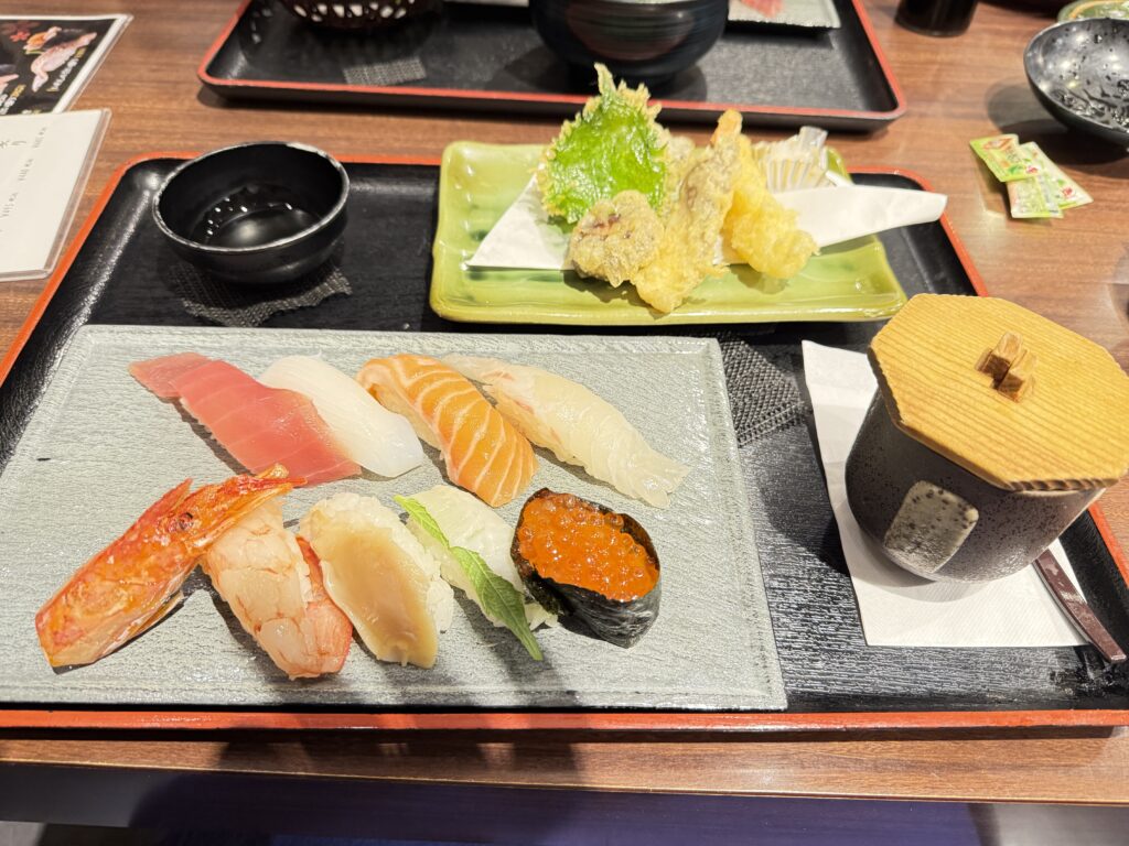 お寿司8貫、天ぷら5種盛り、茶わん蒸しです。